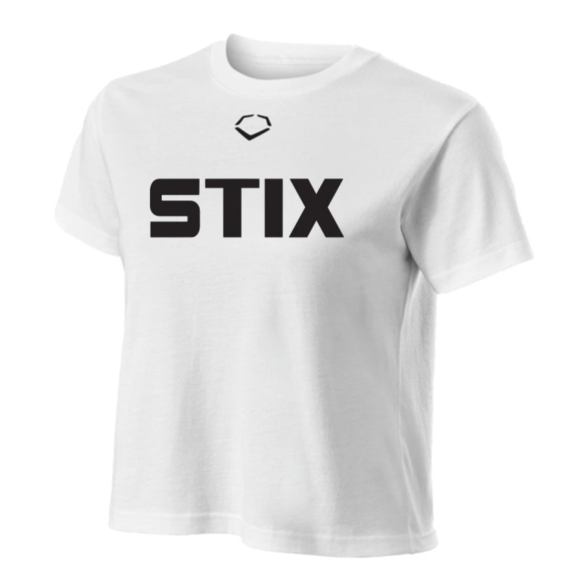 The Evoshield Women's Stix Crop Tee is a performance-oriented athletic top designed for active women. It features a cropped cut for a modern, stylish look and is made with lightweight, moisture-wicking fabric that helps keep the body dry during intense physical activity. The tee is part of Evoshield's sportswear collection and is designed to offer both comfort and flexibility, making it suitable for training, workouts, or casual wear. The fabric is breathable, and the design typically incorporates bold branding and a sporty aesthetic.