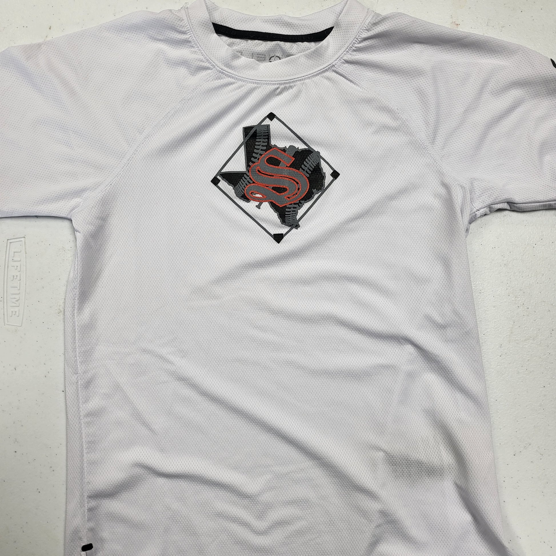 This youth training tee features a bold white design with the Stix Diamond logo, showcasing a baseball diamond and the Stix Crest. The added laces detail gives it a sporty, unique look. Made with lightweight, breathable fabric, this tee keeps young athletes cool and comfortable during practice or casual outings. Whether they're hitting the field or hanging out, this shirt ensures your player stands out while representing their team in style.